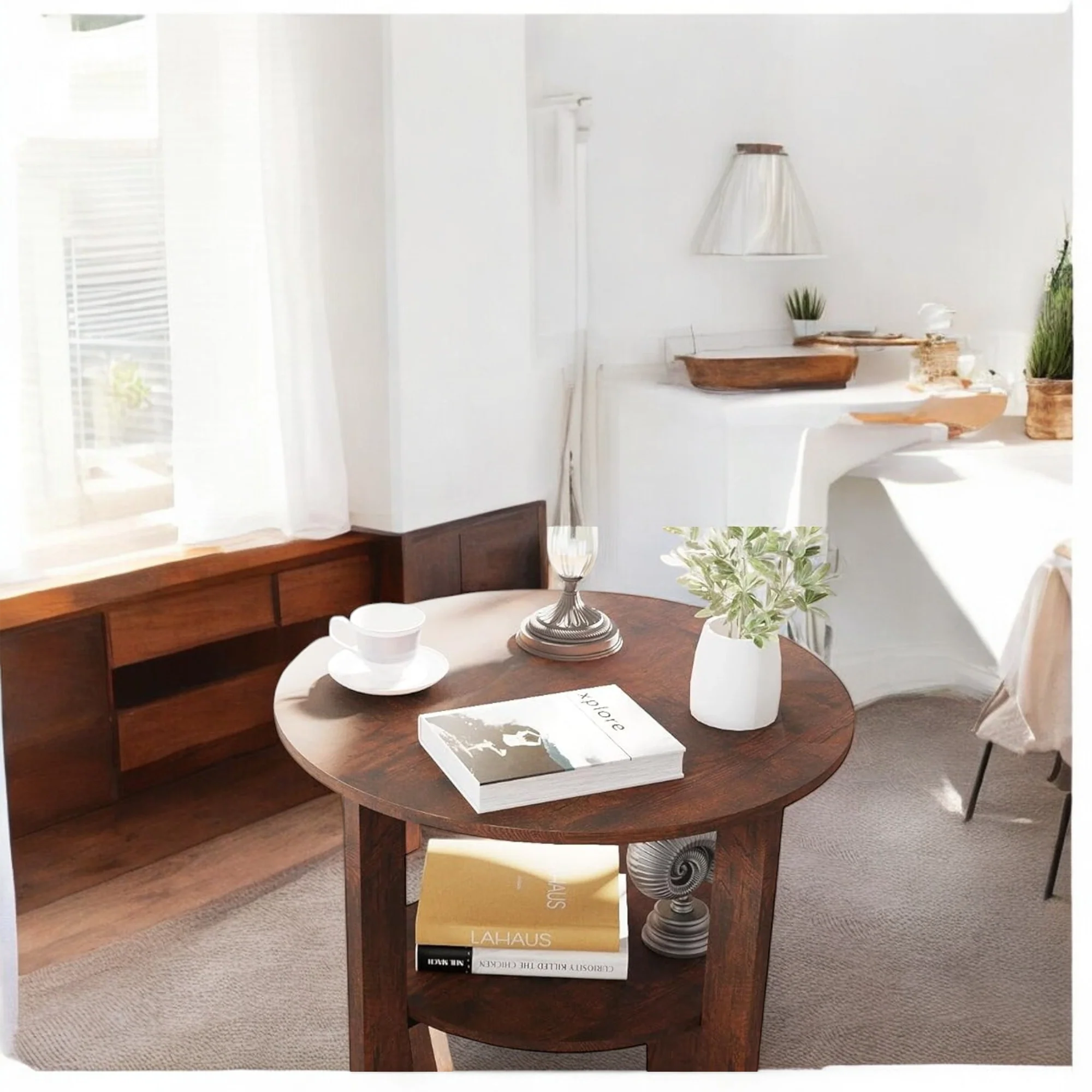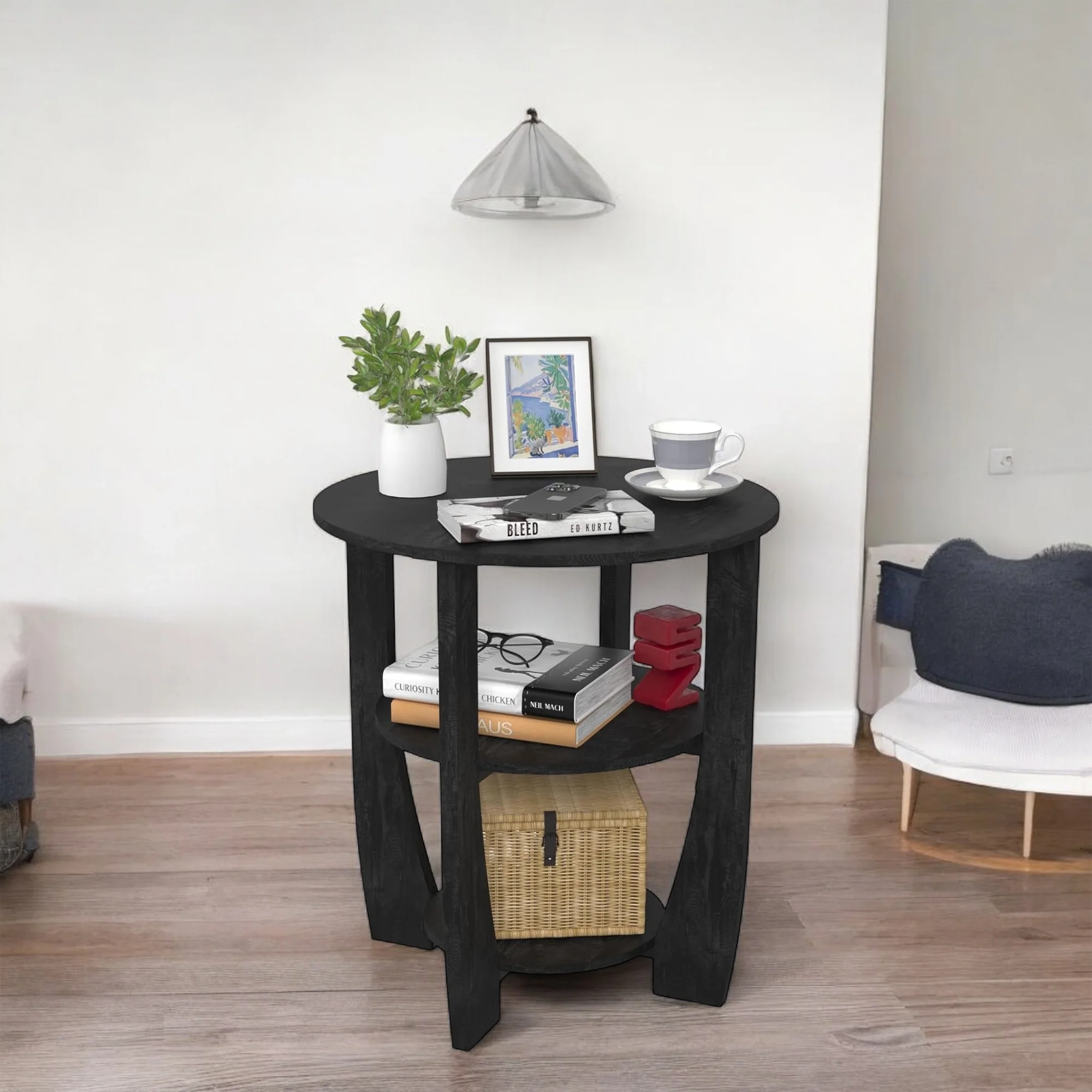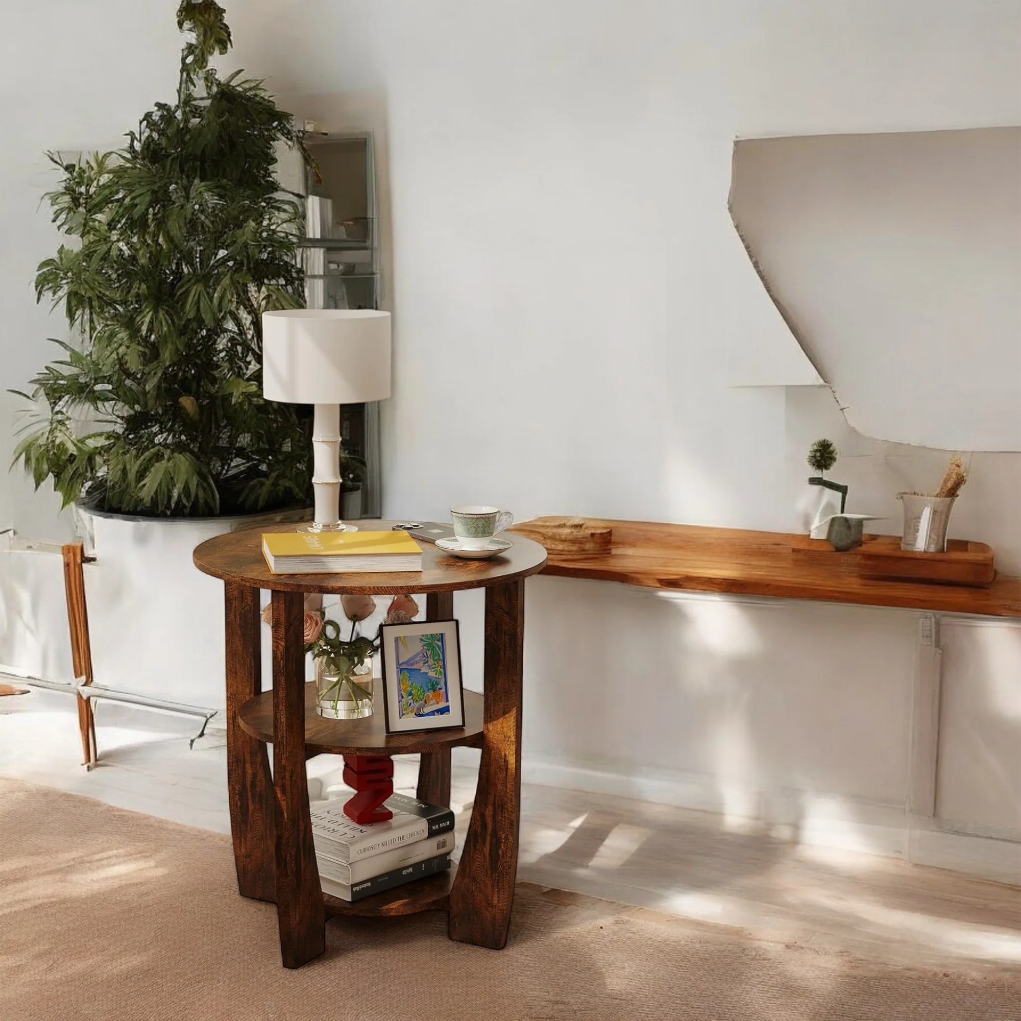 This round solid wood accent table offers everyday utility with a light, welcoming profile. Three tiers of shelving provide vertical storage for books, baskets, and tech accessories while keeping the footprint tight for smaller rooms. The circular top reduces hard corners in walkways, improving flow around sofas and lounge chairs. A balanced height works well as a side table for reading lamps or as a display stand for plants and framed photos in open plan spaces. Built for consistent use, the shelves are set to stable intervals to prevent crowding and to support even weight distribution. The smooth finish is simple to maintain with regular dusting, and non marking glides help protect wood and tile floors. The solid wood structure adds natural warmth and subtle grain variation, making the piece feel at home with modern, Scandinavian, and farmhouse decor. Style the table as a compact drink station, a plant stand near a window, or a layered storage solution next to a sectional. Care is minimal: avoid prolonged moisture, blot spills quickly, and use coasters to preserve the surface. The package includes one side table; decorative items are not included. Measurements and color information are available on request to help you plan a cohesive living room arrangement. Designed for residential use. Materials and colors may vary slightly from images due to natural variation and screen settings. Designed for residential use. Materials and colors may vary slightly from images due to natural variation and screen settings. Designed for residential use. Materials and colors may vary slightly from images due to natural variation and screen settings. Designed for residential use. Materials and colors may vary slightly from images due to natural variation and screen settings. Designed for residential use. Materials and colors may vary slightly from images due to natural variation and screen settings.
